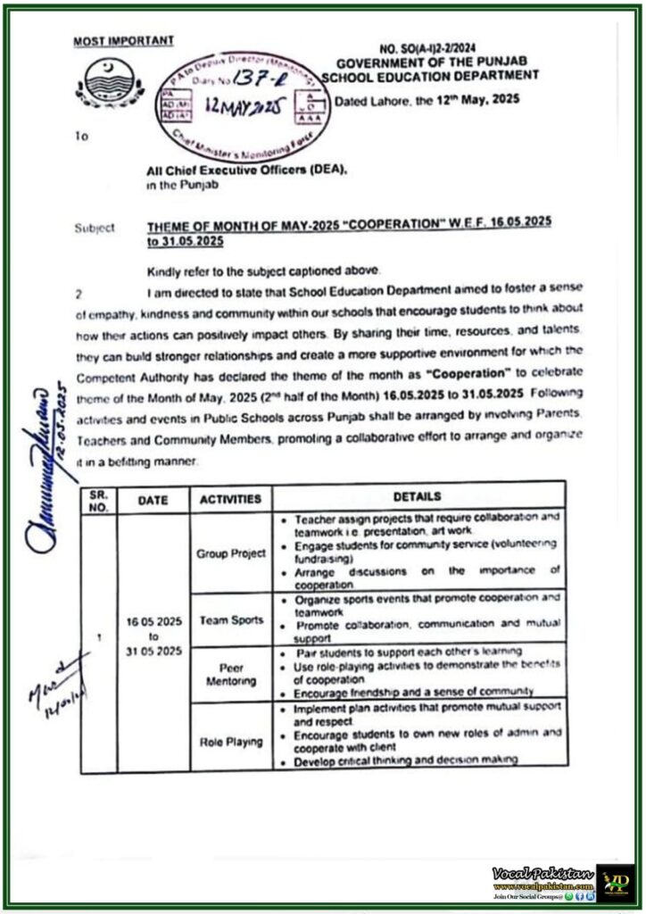 In a bid to cultivate empathy, teamwork, and a culture of collaboration among students, the Government of Punjab’s School Education Department has officially declared “Cooperation” as the Theme of the Month for May 2025 (from 16th to 31st May). This latest government notification is part of the department’s ongoing monthly theme initiative aimed at character building and community development in schoolchildren. Activities including group projects, team sports, role-playing, and peer mentoring will be held across public schools in Punjab.