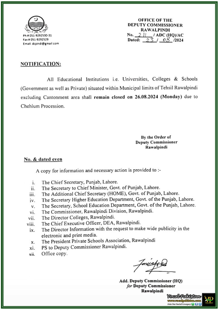All Educational Institutions i.e. Universities, Colleges & Schools (Government as well as Private) situated within Municipal limits of Tehsil Rawalpindi excluding Cantonment area shall remain closed on 26.08.2024 (Monday) due to Chehlum Procession.