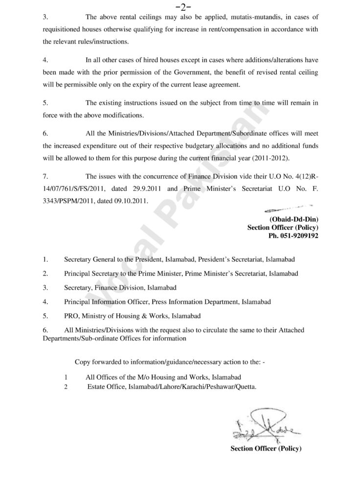 The Federal Government is pleased to notify 25% enhancement in existing rental ceiling for hiring of residential accommodation in Federal Ministry/Division/Attached Department/Subordinate Offices at Islamabad, Rawalpindi, Karachi, Lahore, Quetta and Peshawar as under:-