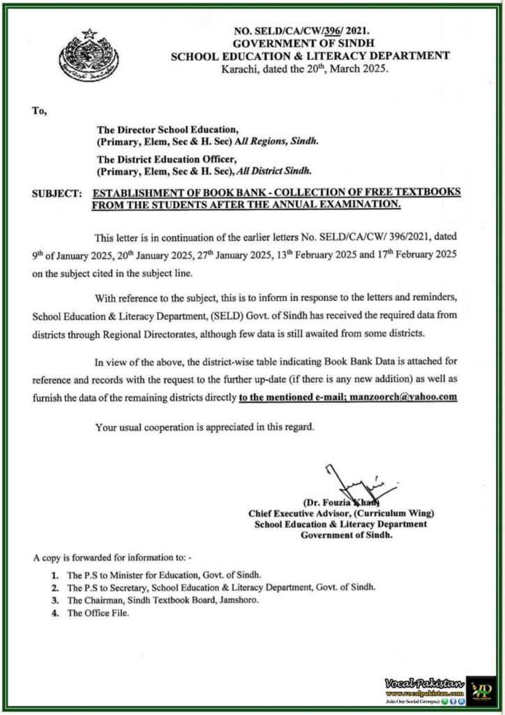 The School Education & Literacy Department (SELD), Government of Sindh, has taken a significant step towards sustainable education by implementing the Book Bank initiative. In a recent notification, SELD has directed all regional and district education authorities to collect free textbooks from students after annual examinations.