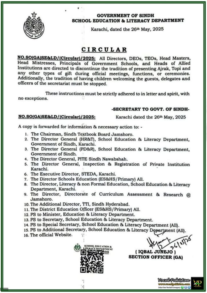 In a fresh and direct move towards streamlining official protocols, the Government of Sindh’s School Education & Literacy Department has issued a strict circular banning the presentation of Ajrak, Sindhi Topi, and other cultural gifts during any official school functions, meetings, or ceremonies. This decision also extends to stopping the practice of having students welcome officials and guests at such events.