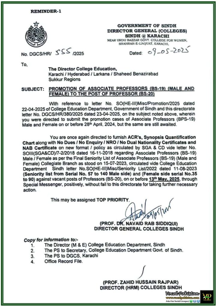 You are once again directed to furnish ACR’s, Synopsis Quantification Chart along with No Dues / No Enquiry / NRO / No Dual Nationality Certificates and NAB Certificate on new format / policy as circulated by SGA & CD vide letter No. SOIII(SGA&CD)7-2/2018 dated 16-11-2018 regarding Associate Professors (BS-19) Male / Female as per the Final Seniority List of Associate Professors (BS-19) (Male and Female) Colleglate Branch as stood on 15-07-2023, circulated vide College Education Department Sindh letter No.SO(HE-IlI)Misc/Seniority List/2022 dated 11-08-2023 (Seniority list from Serial No. 57 to 140 Male side) and (Female side serial No.35 to 90) against vacant posts of Professors (BS-20), on or before 13th May, 2025, through Special Messenger, positively, without fail to this directorate for taking further necessary action