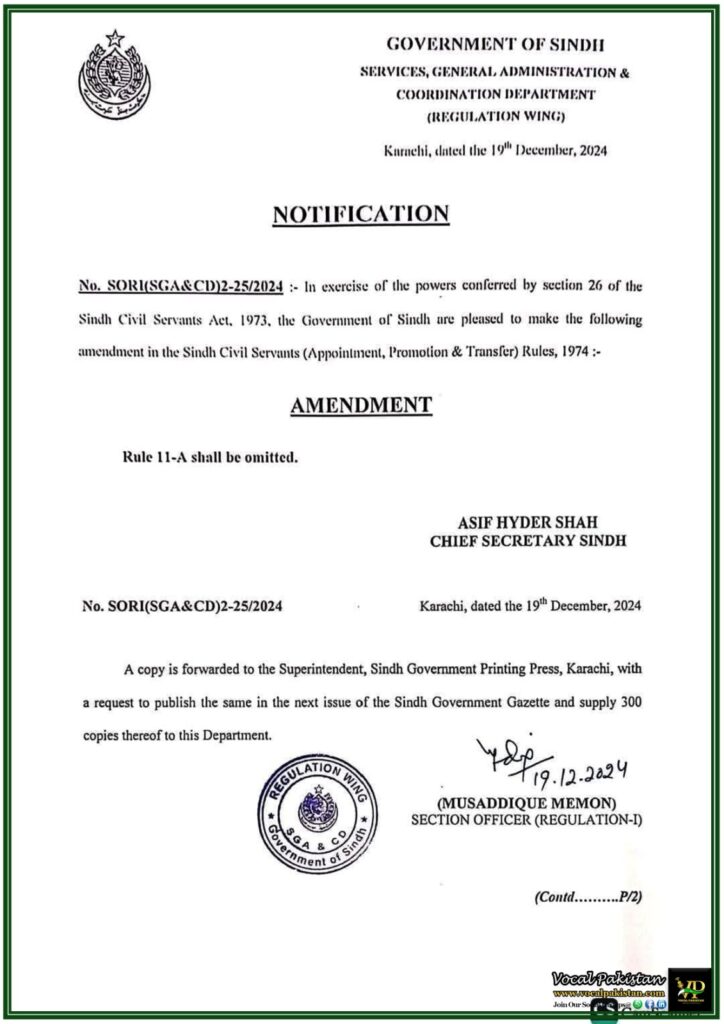 No. SORI(SGA&CD)2-25/2024:- In exercise of the powers conferred by section 26 of the Sindh Civil Servants Act. 1973, the Government of Sindh are pleased to make the following amendment in the Sindh Civil Servants (Appointment, Promotion & Transfer) Rules, 1974 :-