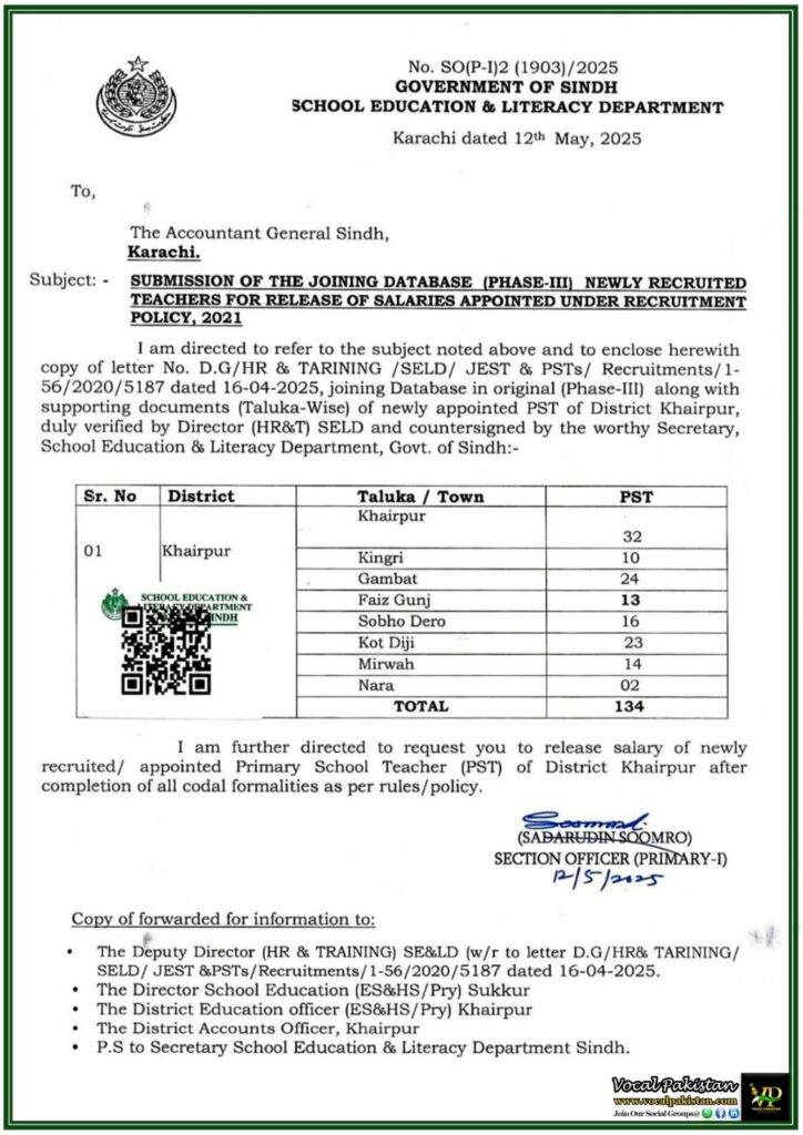 In a major relief for newly appointed teachers in District Khairpur, the School Education & Literacy Department (SELD), Government of Sindh, has officially submitted the Joining Database (Phase-III) for 134 Primary School Teachers (PSTs) recruited under the Teacher Recruitment Policy 2021. The database, submitted Taluka-wise, includes appointments from Khairpur, Kingri, Gambat, Faiz Gunj, Sobho Dero, Kot Diji, Mirwah, and Nara.
