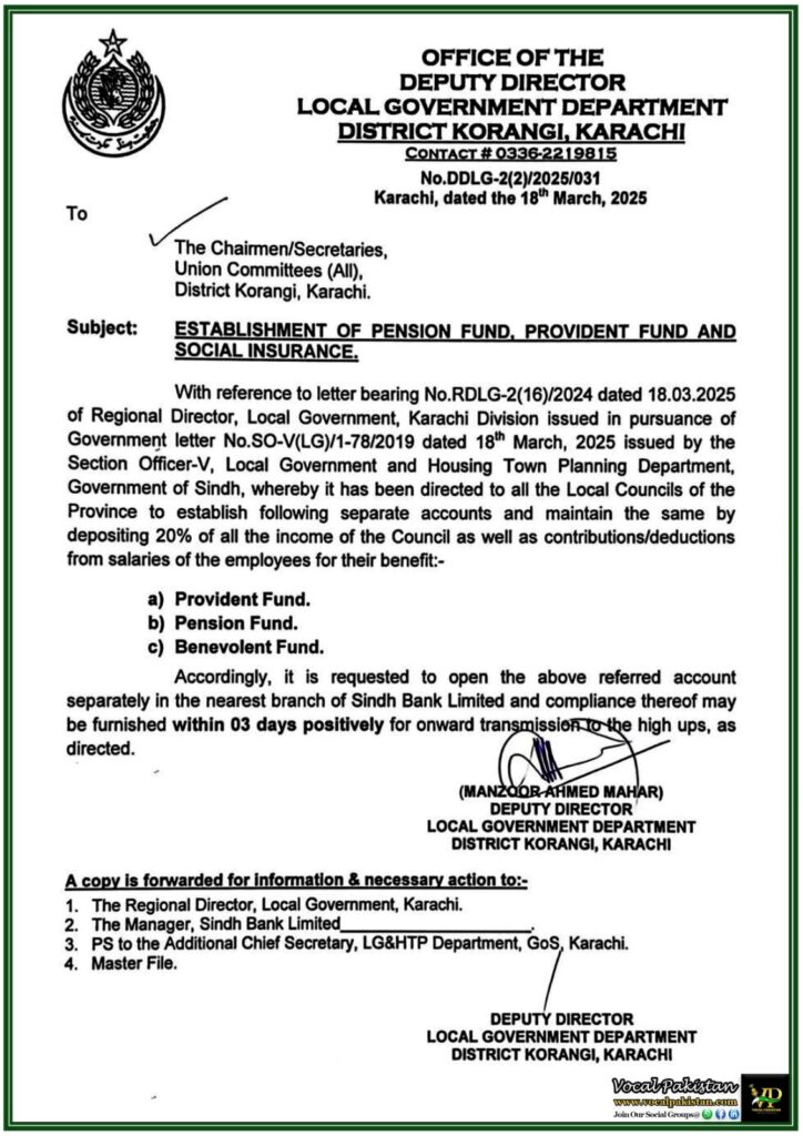 The Local Government Department of Sindh has issued a crucial directive to all Union Committees in District Korangi, Karachi, mandating the establishment of separate funds for employees’ financial security. As per the latest government notification, all local councils across the province are required to deposit 20% of their total income, along with salary deductions, into three dedicated accounts: