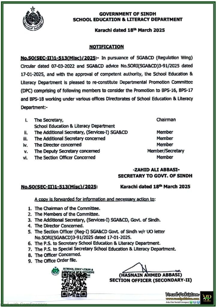 No.SO(SEC-II)1-513(Misc)/2025:– In pursuance of SGA&CD (Regulation Wing) Circular dated 07-03-2022 and SGA&CD advice No.SORI(SGA&CD)3-91/2025 dated 17-01-2025, and with the approval of competent authority, the School Education & Literacy Department is pleased to re-constitute Departmental Promotion Committee (DPC) comprising of following members to consider the Promotion to BPS-16, BPS-17 and BPS-18 working under various offices Directorates of School Education & Literacy Department:-