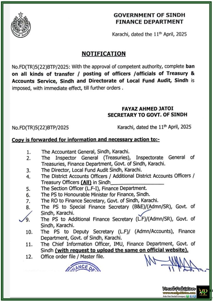In a significant administrative move, the Government of Sindh has issued a Government Notification dated 11th April 2025, announcing a complete ban on all kinds of transfer/posting of officers and officials belonging to Sindh Treasury & Accounts Service and Directorate of Local Fund Audit. This ban is effective immediately and shall remain in place until further orders.