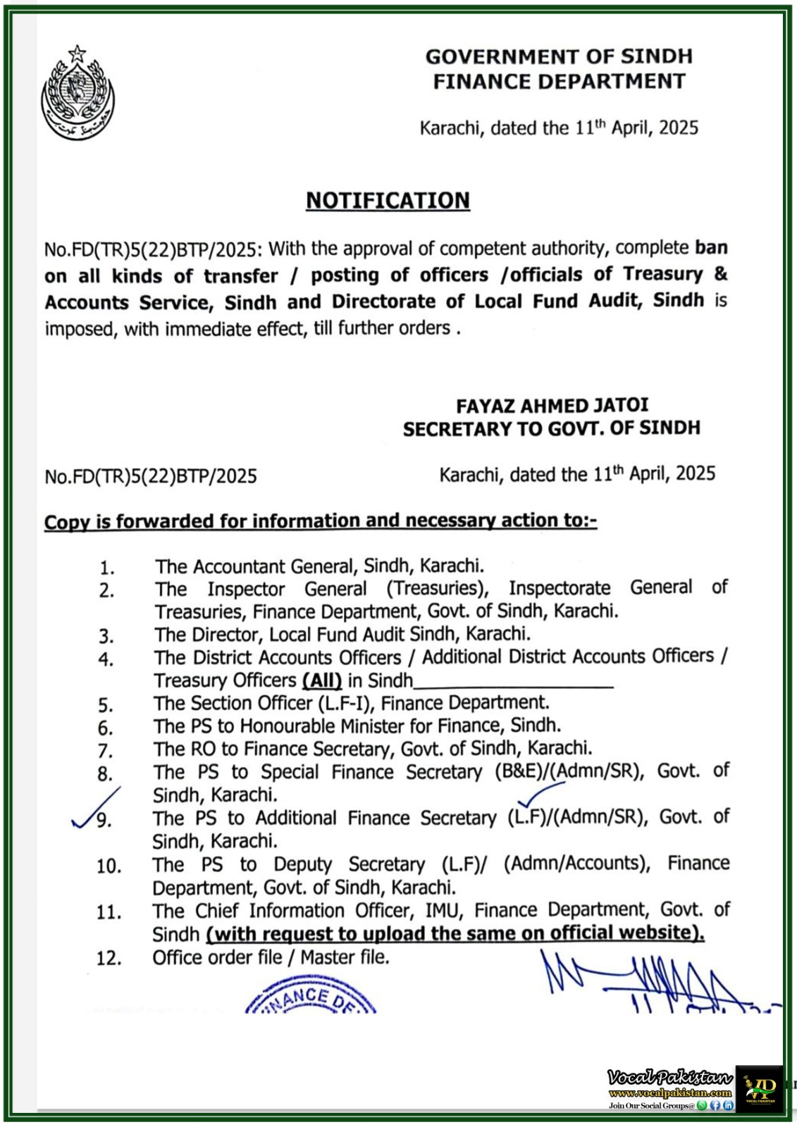 This update is especially relevant for civil servants, administrative departments, and those following Sindh’s finance-related decisions. Vocal Pakistan ensures you get timely, authentic and verified Government Notifications from across Pakistan, whether federal or provincial. Please find notification: