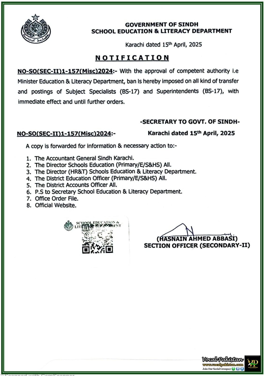 The School Education & Literacy Department, Government of Sindh, has officially imposed a ban on all kinds of transfer and postings of Subject Specialists (BS-17) and Superintendents (BS-17) across the province. This action was approved by the Minister for Education & Literacy Department and is effective immediately from 15th April, 2025, continuing until further orders.