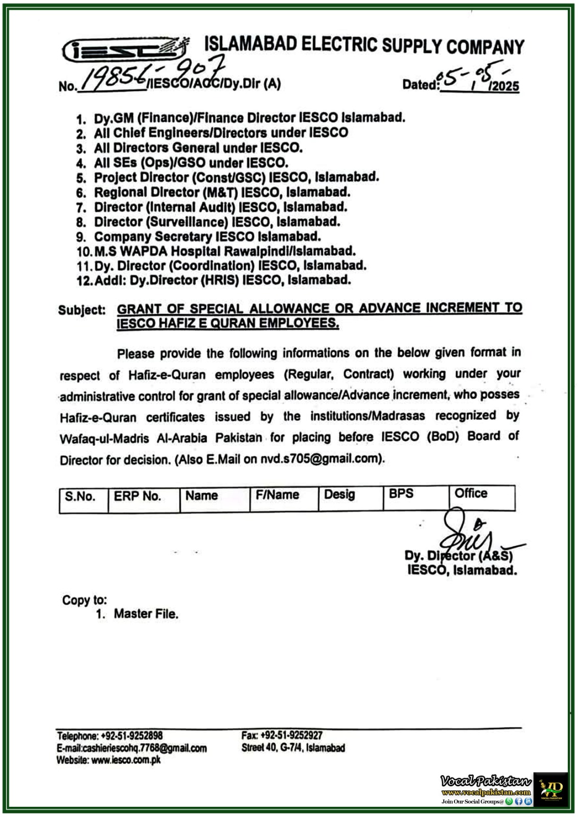 The Islamabad Electric Supply Company (IESCO) has issued a formal notification dated 5th May 2025 concerning the grant of special allowance or advance increment for employees who are Hafiz-e-Quran. This step is being taken to honor and recognize employees who have memorized the Holy Quran and hold valid Hafiz-e-Quran certificates from Wafaq-ul-Madaris Al-Arabia Pakistan recognized institutions.
