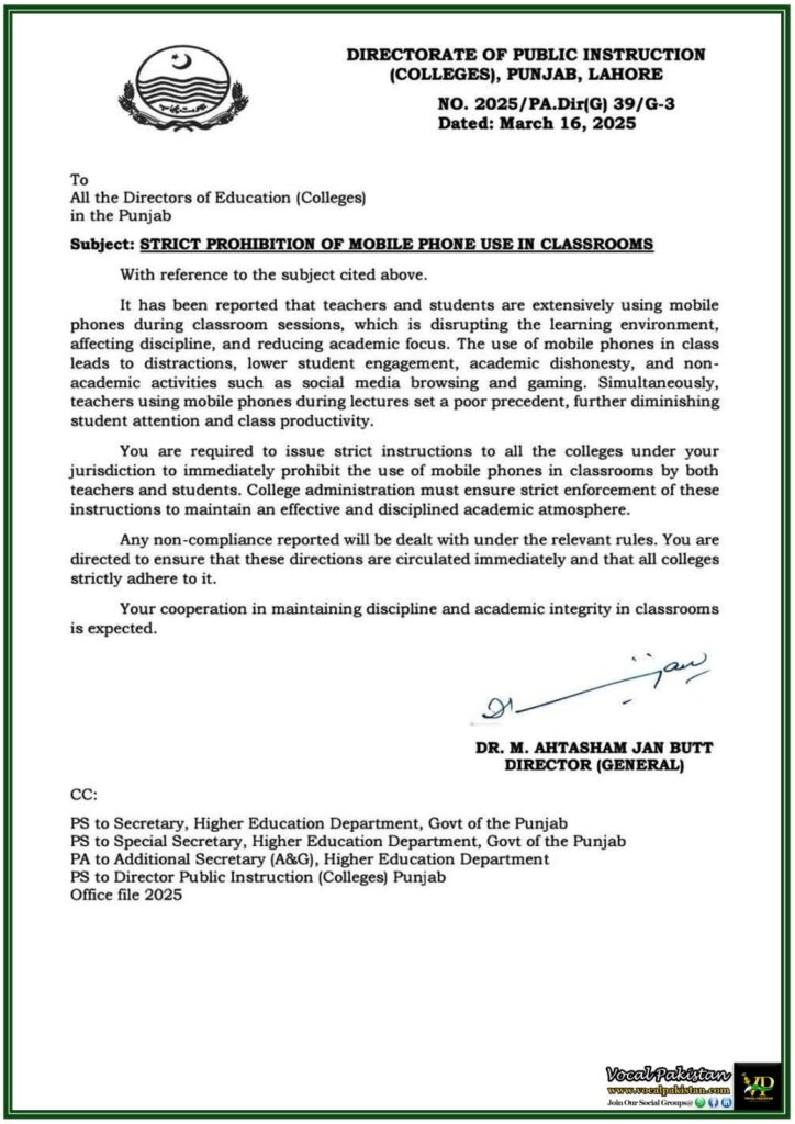 The Punjab Higher Education Department urges all college administrations to implement this policy without exception. Any violations will be strictly dealt with, ensuring that classrooms remain free from distractions and dedicated to quality education.