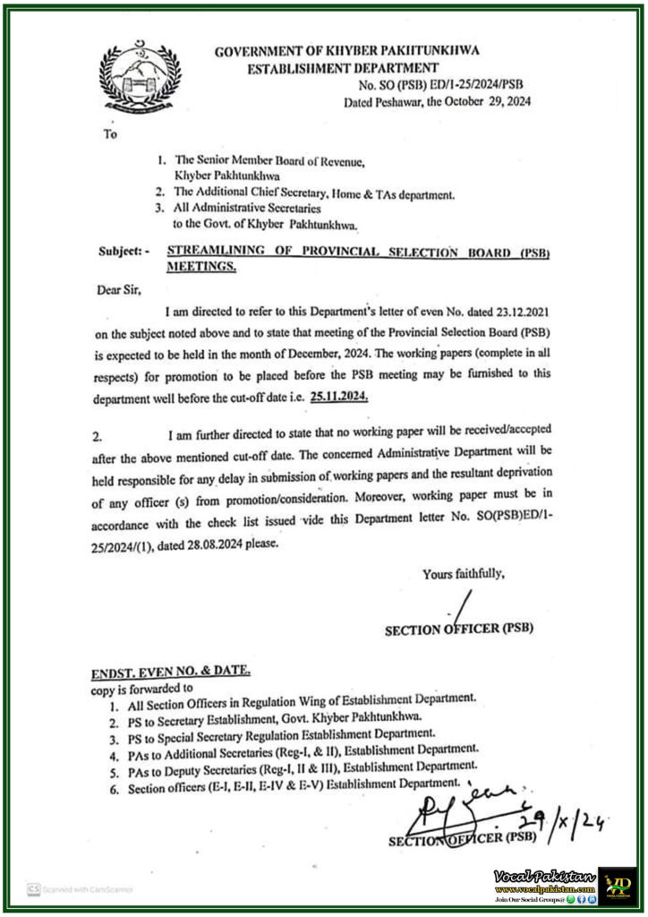 I am directed to refer to this Department’s letter of even No. dated 23.12.2021 on the subject noted above and to state that meeting of the Provincial Selection Board (PSB) is expected to be held in the month of December, 2024. The working papers (complete in all respects) for promotion to be placed before the PSB meeting may be furnished to this department well before the cut-off date i.e. 25.11.2024.