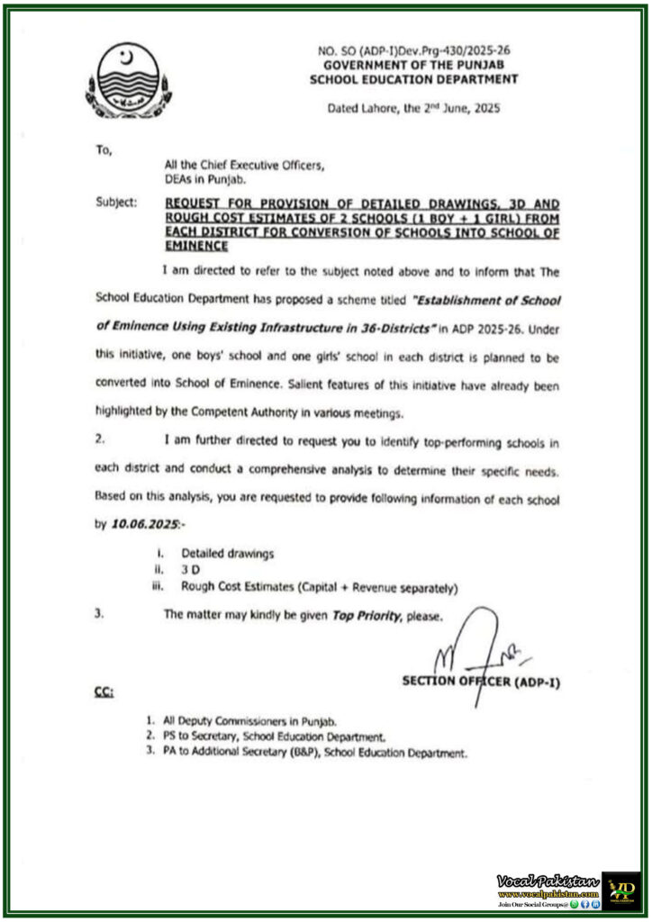 Authorities across the province are now being directed to prepare detailed drawings, 3D models, and rough cost estimates for the selected institutions. This transformation is a significant step toward achieving the goals of quality education and smart governance in Pakistan. For those looking for updates on Punjab Education Department News, School Development Projects, or latest ADP notifications, this development marks a key highlight in 2025. Please find notification: