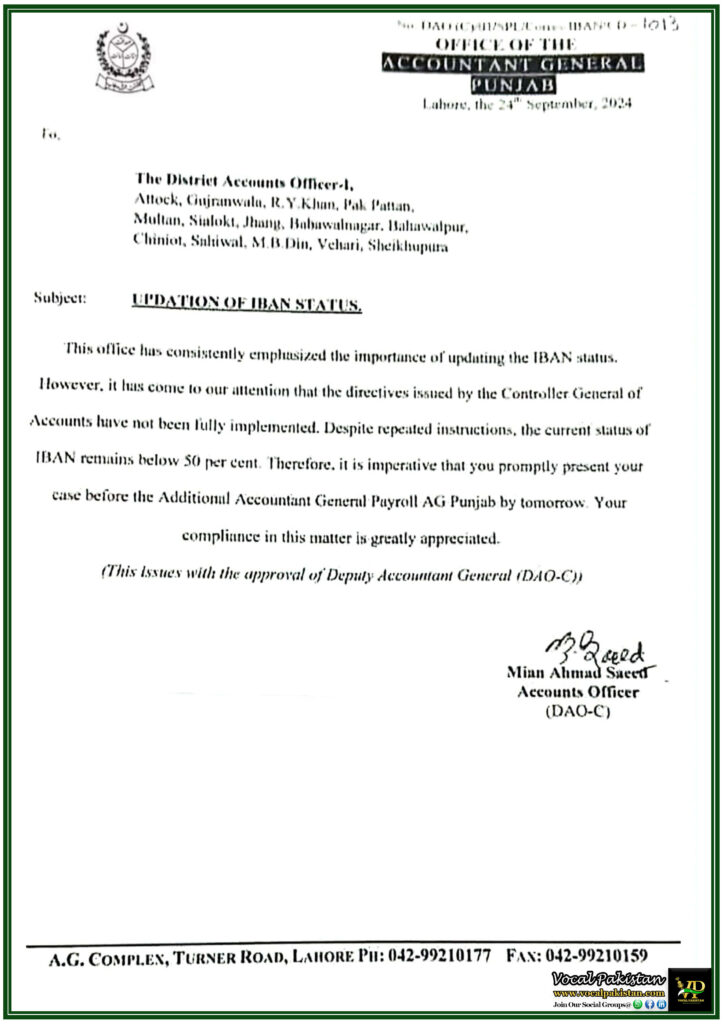 However, it has come to our attention that the directive issue by the controller general of accounts have not been fully implemented. Despite repeated instructions, the current status of IBAN remains below 50%. Therefore, it is imperative that you promptly present your case before the additional Accountant General payroll AG Punjab by tomorrow. Your compliance in this matter is greatly appreciated.
