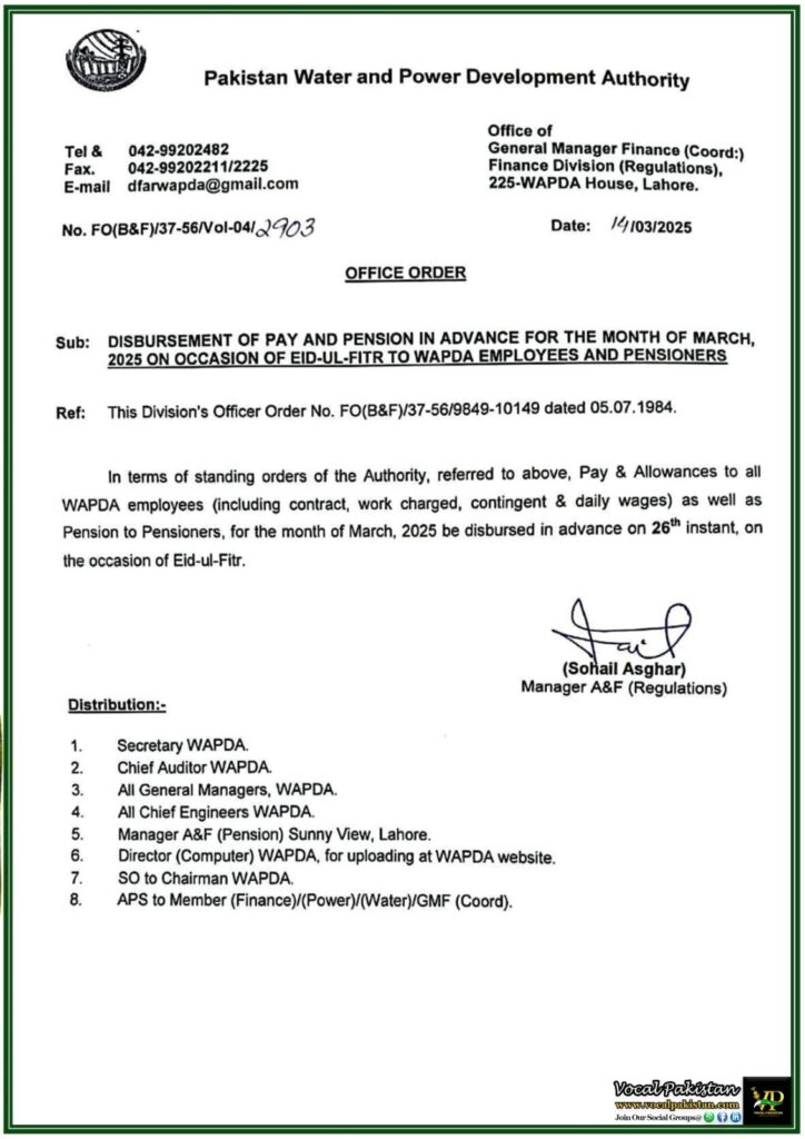 In terms of standing orders of the Authority, referred to above, Pay & Allowances to all WAPDA employees (including contract, work charged, contingent & daily wages) as well as Pension to Pensioners, for the month of March, 2025 be disbursed in advance on 26th instant, on the occasion of Eid-ul-Fitr.